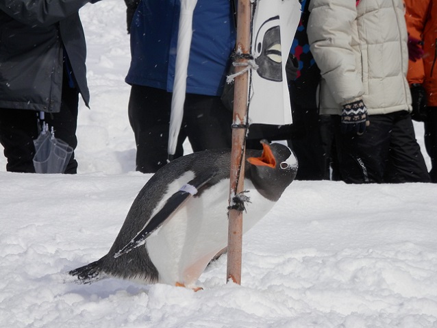 12羽のペンギンがコースを歩いてくると歓声があがり写真を撮り始める人が続出しますが、ペンギンはそんなことはお構いなしに散歩コースから外れたり、トボガン(腹這いになり翼を使って進む状態のことです)をしたり、いろいろなペンギンの様子を見ることが出来て非常に満足でした。